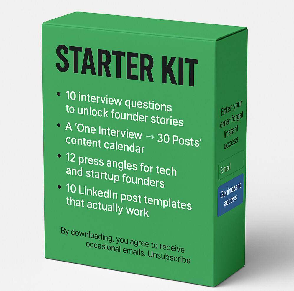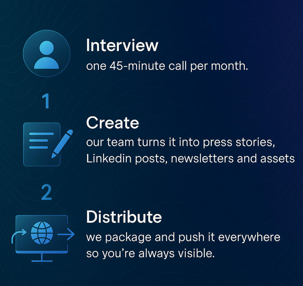 We turn a 45-minute monthly chat with your founder into 30 days of PR, LinkedIn, and marketing content